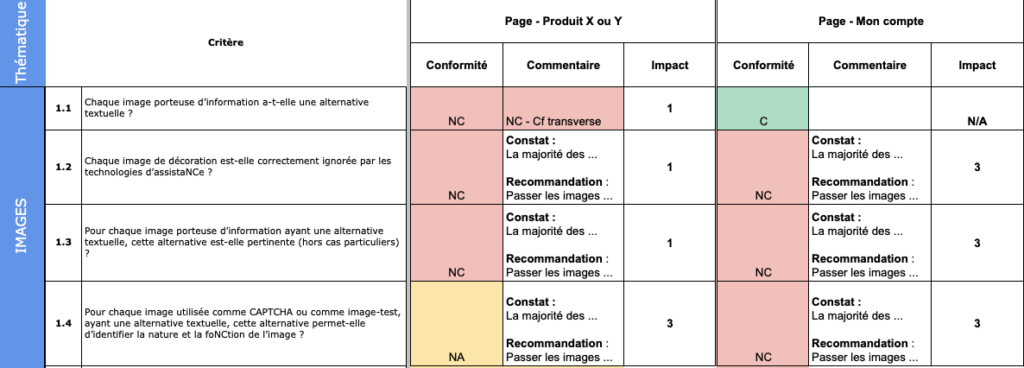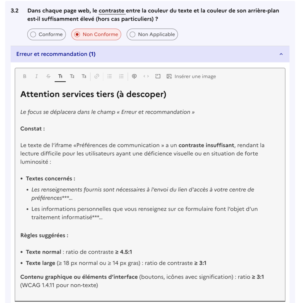 Identifiez dès le départ les non-conformités que vous ne pourrez pas corriger (contraintes framework, services tiers, limitations techniques avérées). Documentez-les et partagez-les avec les partie prenantes. Cela permet de calibrer les attentes et de concentrer l’effort sur les corrections qui auront un impact réel.